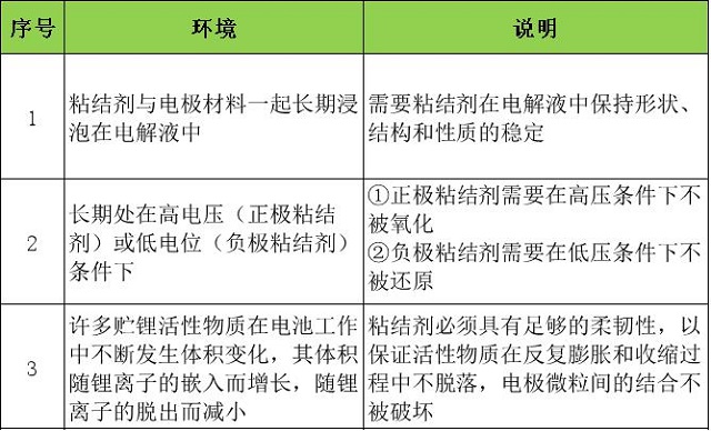 電極粘結(jié)劑環(huán)境特殊,因此需滿足特殊的性能要求。