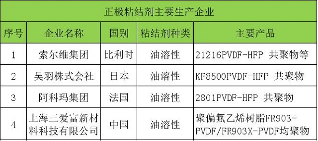 ②比利時(shí)的索爾維集團(tuán)、日本的吳羽株式會(huì)社、法國(guó)的阿科瑪集團(tuán),都是PVDF粘結(jié)劑廠商中的佼佼者,共享全球鋰電池正極粘結(jié)劑的市場(chǎng)。